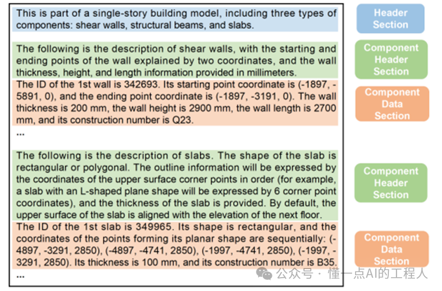 BIM数据是结构化的,而LLM需要自然语言输入。研究团队设计了一套半结构化的文本表达方法,将每个构件的信息转化为类似下面的描述: