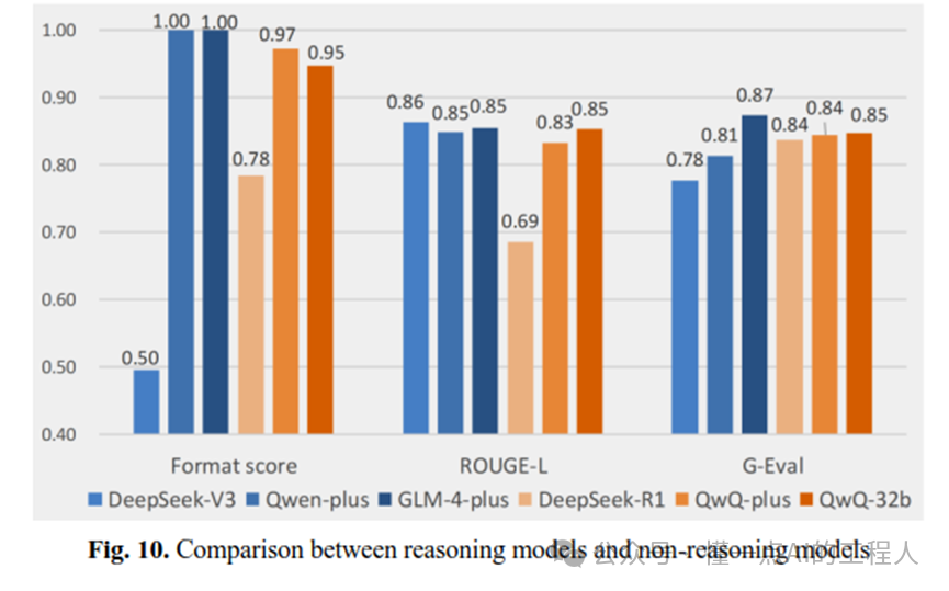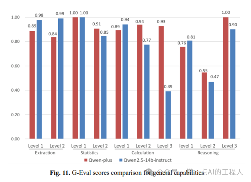 为了量化评估,团队采用了多指标体系,包括文本相似度指标(BLEU、ROUGE-L)和语义相似度指标(余弦相似度、G-Eval)。其中,G-Eval是使用另一个LLM(GLM-4-plus)按照精细规则打分的,规则明确指出:判断性结果和数据准确性占90%的权重,表达方式差异不扣分,计算误差3%以内算正确。实验证明,G-Eval评分最接近人类专家的判断。