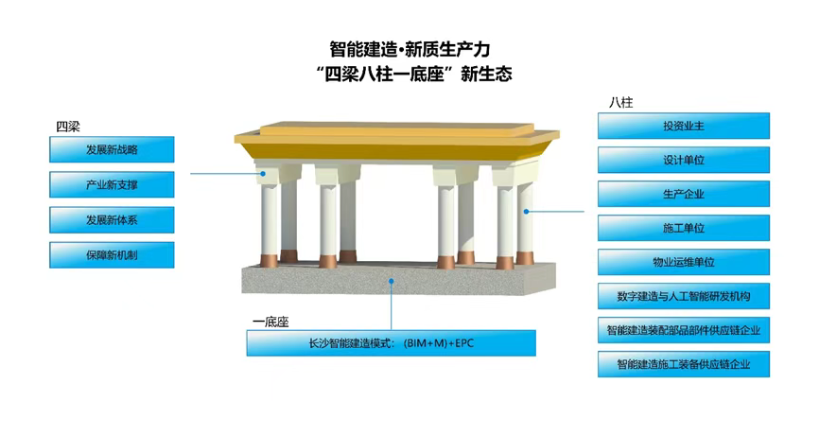 “智能建造·四梁八柱一底座”是长沙推动智能建造现代化产业体系建设的战略思路,其中:“一底座”即创新提出“(BIM+M)+EPC”新型建造方式和建设管理模式,以数字(BIM)串联为实现路径,以工业生产(M)为实施载体,以集约管理(EPC)为实践手段,实现“1+1+1>3”的效果。“四梁”即从“发展新战略、建造新模式、产业新体系、保障新机制”四个方面系统谋划,确定了2026年、2030年智能建造产值分别突破3000亿、5000亿的战略目标。“八柱”即从市场主体的角度创新构建“八大新型责任主体”,在原有五方责任主体基础上,新增物业运维单位、数字建造与人工智能研发机构、智能装配式建造部品部件产业链企业,智能建造施工装备供应链企业,形成覆盖全产业链的协同网络。